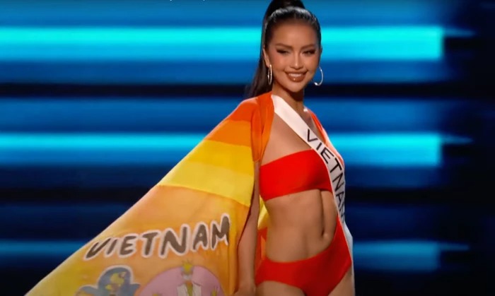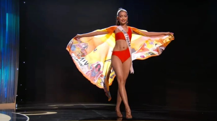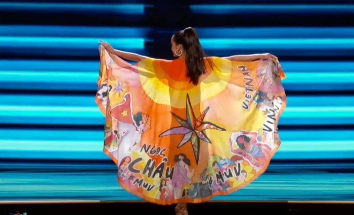 Ngay khi vừa bước ra, Ngọc Châu đã khiến khán giả phải "gào thét" với vẻ ngoài quá sức tỏa sáng. Cô diện bikini màu cam, ton-sur-ton với chiếc áo choàng "Giấc mơ Việt Nam" vô cùng rực rỡ. Có thể thấy áo choàng của đại diện Việt Nam là một trong những thiết kế nổi bật nhất trong dàn thí sinh năm nay.