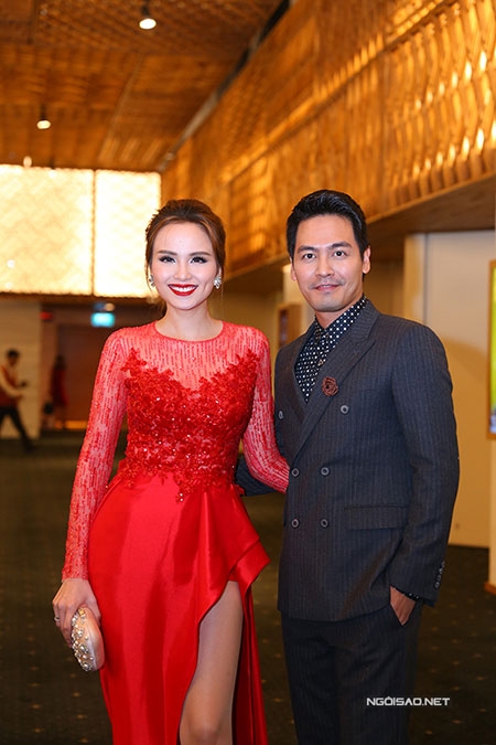 Hoa hậu Diễm Hương cũng khoe chân thon với bộ đầm đỏ rực xẻ thân cao. |