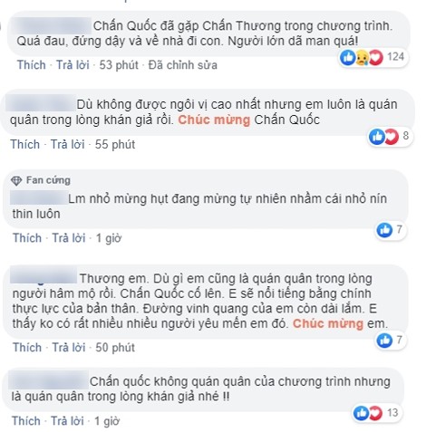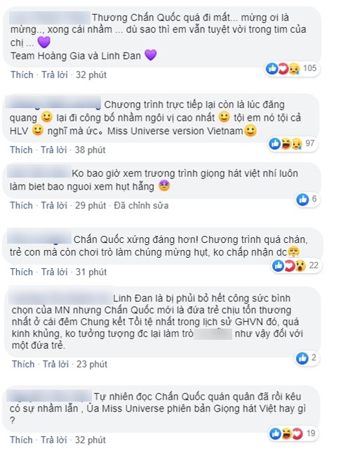 Không riêng gì Chấn Quốc, Hương Giang và Dương Cầm, đông đảo cư dân mạng cũng bày tỏ sự bức xúc lẫn tức giận sau màn đọc nhầm kết quả của MC Nguyên Khang: "Thương Chấn Quốc quá đi mất. Mừng hụt. Dù sao em vẫn tuyệt vời trong tim của khán giả", "Chương trình trực tiếp lại là lúc đăng quang lại công bố sai kết quả. Chắc Miss Universe phiên bản Giọng hát Việt mất", "Tại sao lại có sự nhầm lẫn khiến Chấn Quốc mừng hụt?", "Hương Giang cũng đã bật khóc cùng với thí sinh".