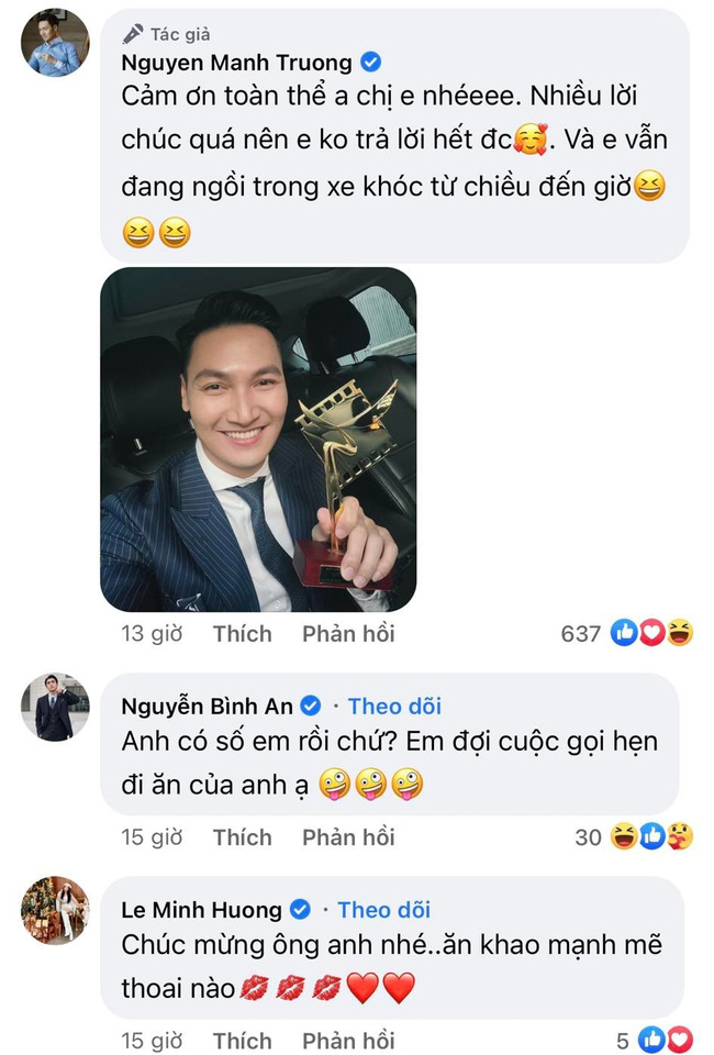 Vì không thể trả lời hết những lời chúc mừng của bạn bè đồng nghiệp, Mạnh Trường đã đăng ảnh cầm cúp và bày tỏ: "Cảm ơn toàn thể anh chị em nhé. Nhiều lời chúc quá nên em không trả lời hết được. Và em vẫn đang ngồi trong xe khóc từ chiều đến giờ".