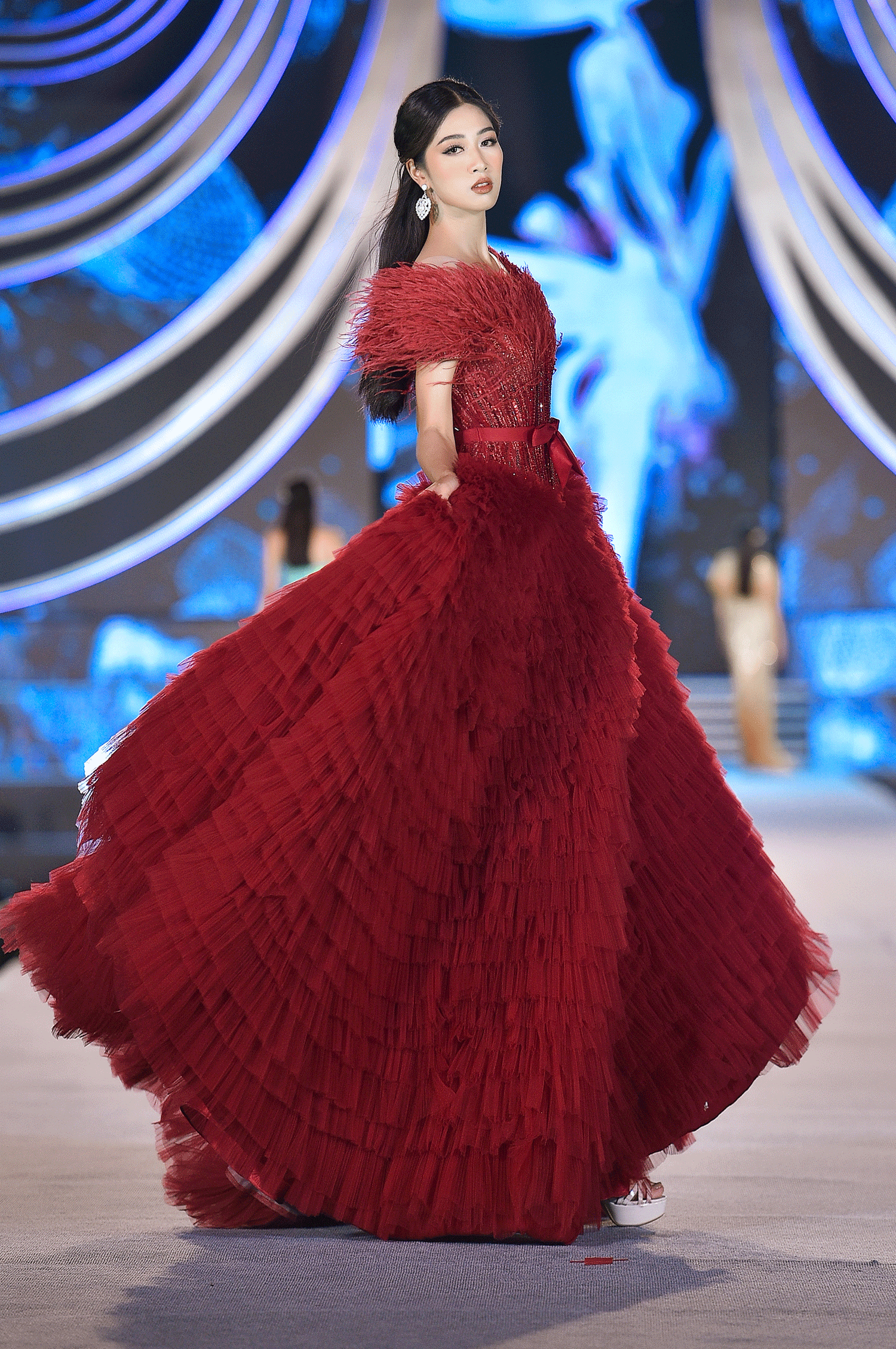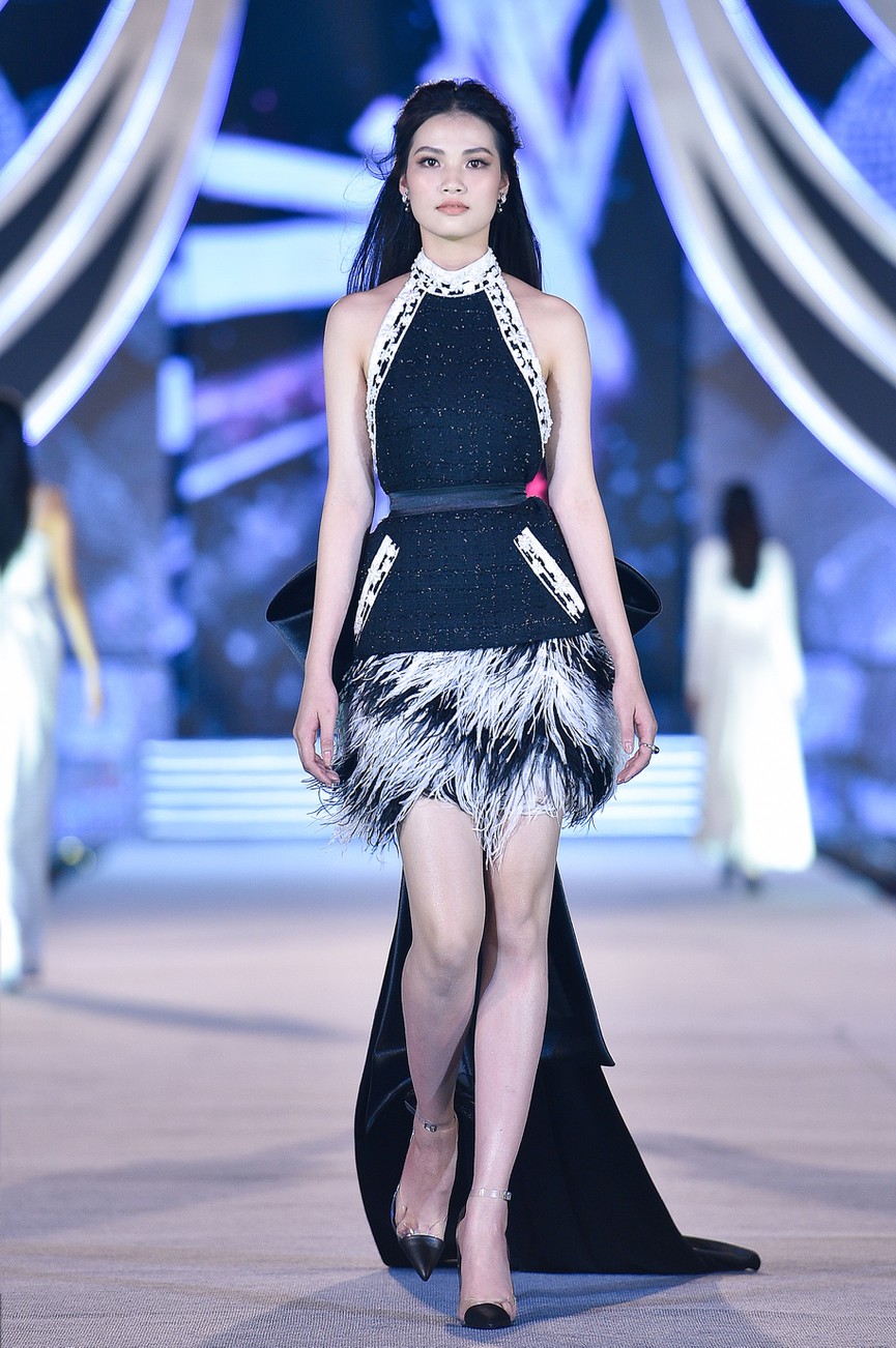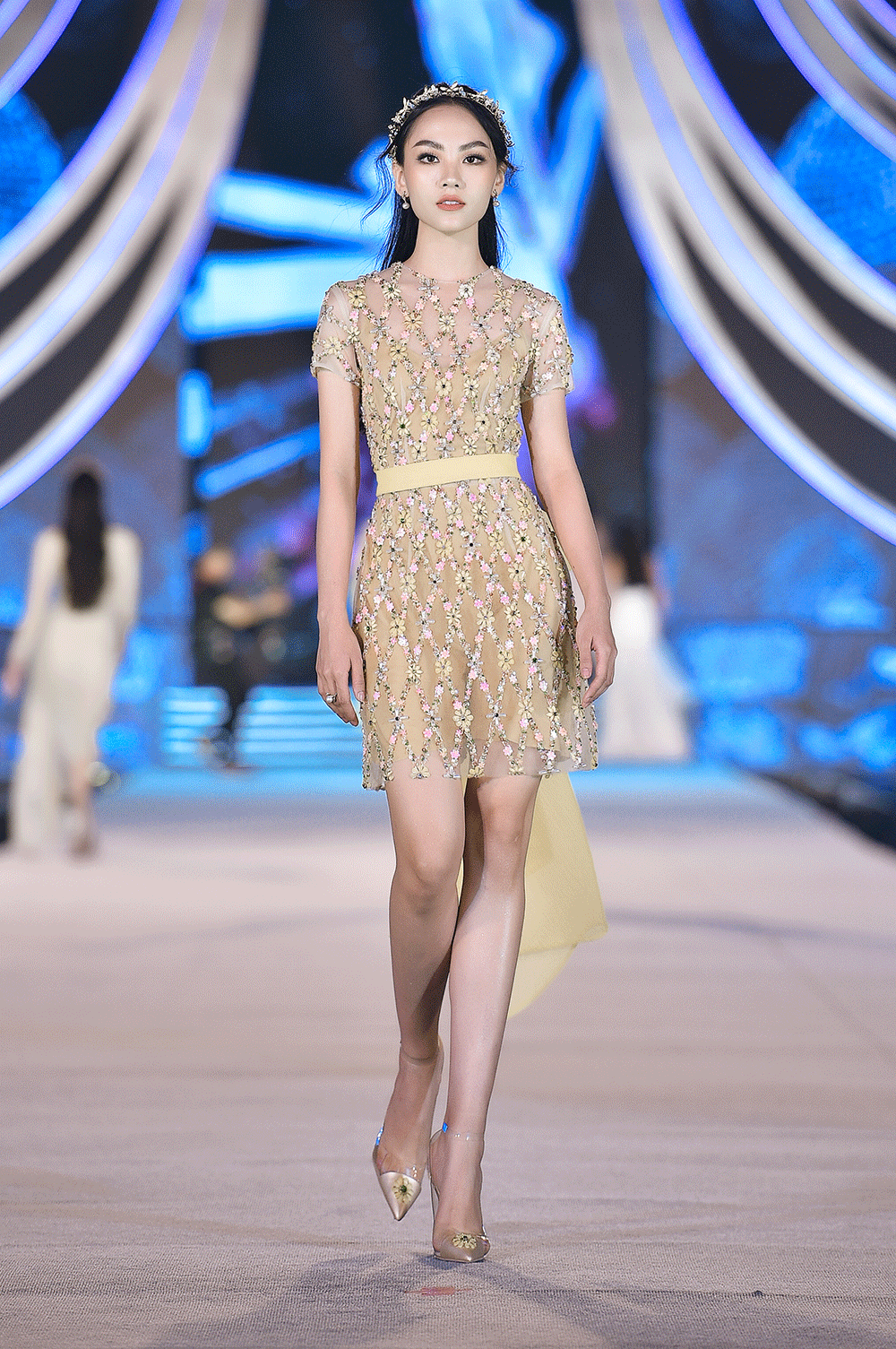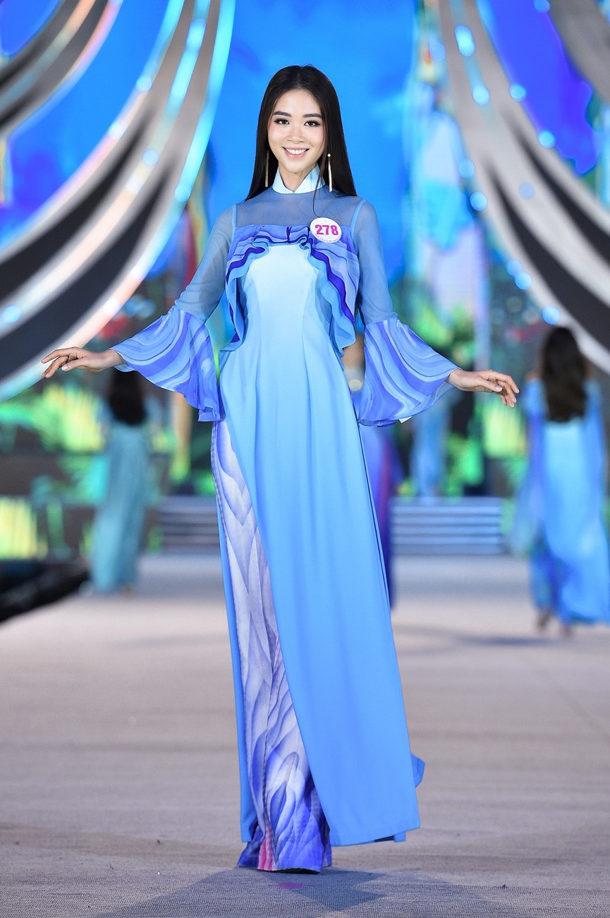 35 thí sinh mở màn đêm thi với phần trình diễn bộ sưu tập áo dài Sắc màu của biển với tông màu đặc trưng của biển gợi cho người xem về một đại dương huyền bí, kỳ ảo mang màu sắc thần tiên.