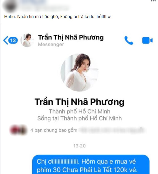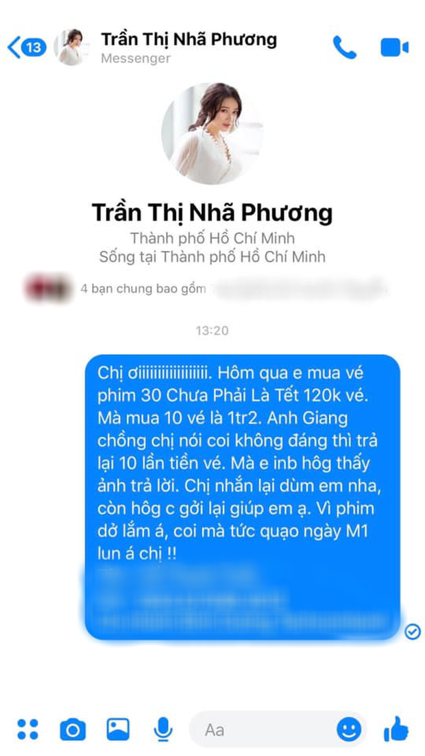 27/01/2020 16:00Nhắn tin đòi Nhã Phương hoàn tiền vé 30 Chưa Phải Tết, khán giả nhận no gạch vì kém duyên