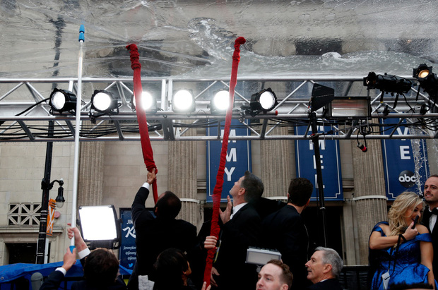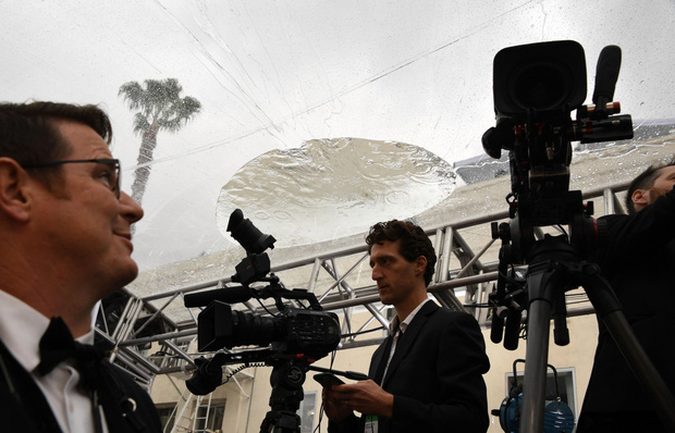 Một cơn mưa lớn đã đổ xuống Los Angeles, Mỹ, khiến thảm đỏ ngoài trời của Oscar bị ướt sũng.