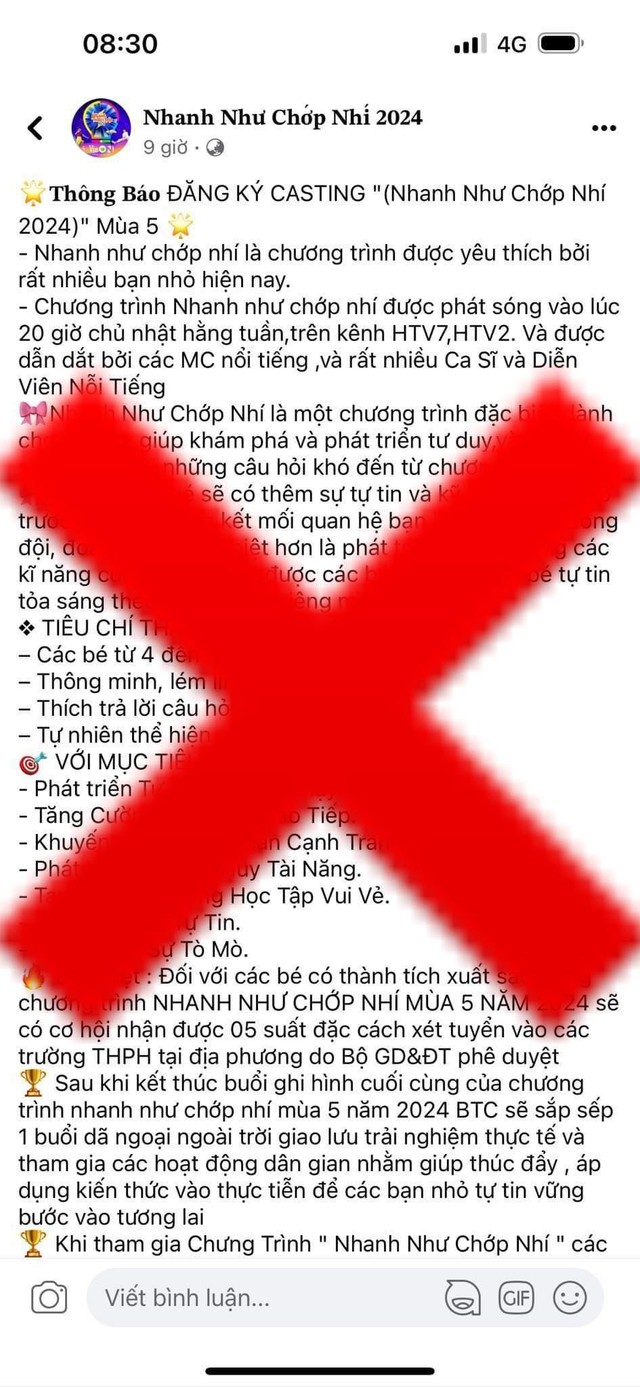 "Vừa qua, chúng tôi có nhận được thông tin một số cá nhân mạo danh chương trình Nhanh như chớp nhí do chúng tôi sản xuất trên các trang mạng xã hội, gọi điện thoại nhằm kêu gọi tham gia các hoạt động, casting... cho mùa 5 của chương trình. Hiện tại, chúng tôi không tổ chức bất kỳ hoạt động, buổi casting nào cho mùa 5 của chương trình. Trong tương lai, nếu tổ chức, mọi thông tin liên quan chỉ được chúng tôi thông báo trên fanpage chính thức của chương trình", đại diện nhà sản xuất cho hay.