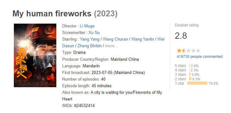 Năm 2023 là thời điểm sự nghiệp của nam thần Dương Dương gặp biến động cực lớn, nhận về nhiều lời chê bai chỉ vì vai diễn trong Khói Lửa Nhân Gian Của Tôi. Cho đến nay, bộ phim của anh và Vương Sở Nhiên vẫn đang tụt giảm điểm số trên Douban, tạm chốt điểm 2,8/10 đến đầu tháng 11. Tuy trở thành đề tài chế giễu vì vai lính cứu hỏa "dầu mỡ" Tống Diệm nhưng Dương Dương vẫn ung dung "bỏ túi" kỷ lục đáng nể.