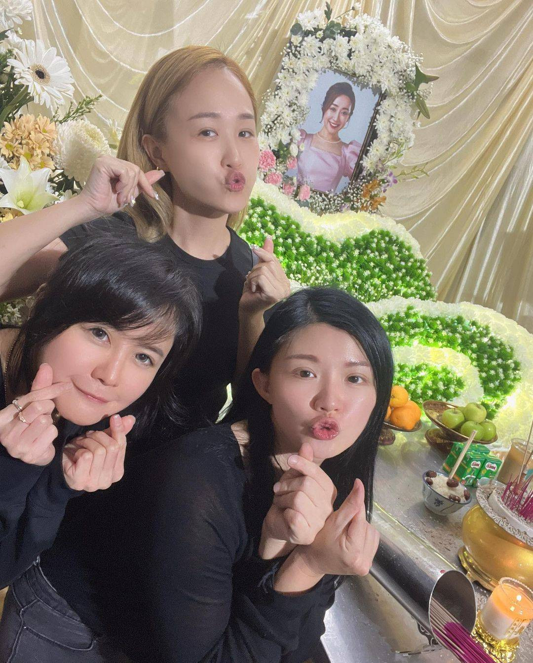 Tuy nhiên, những bức ảnh 3 thành viên chụp tại tang lễ gây ra nhiều tranh cãi vì tươi cười, thoải mái tạo dáng chu môi, bắn tim trước linh cữu Queenzy Cheng.