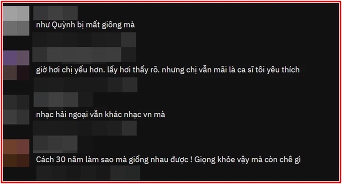 Ở clip so sánh này, về giọng hát, nhiều ý kiến cho rằng Như Quỳnh không còn giữ được phong độ như ngày xưa. Cư dân mạng đã nhận ra nữ ca sĩ thường xuyên hụt hơi khi hát.