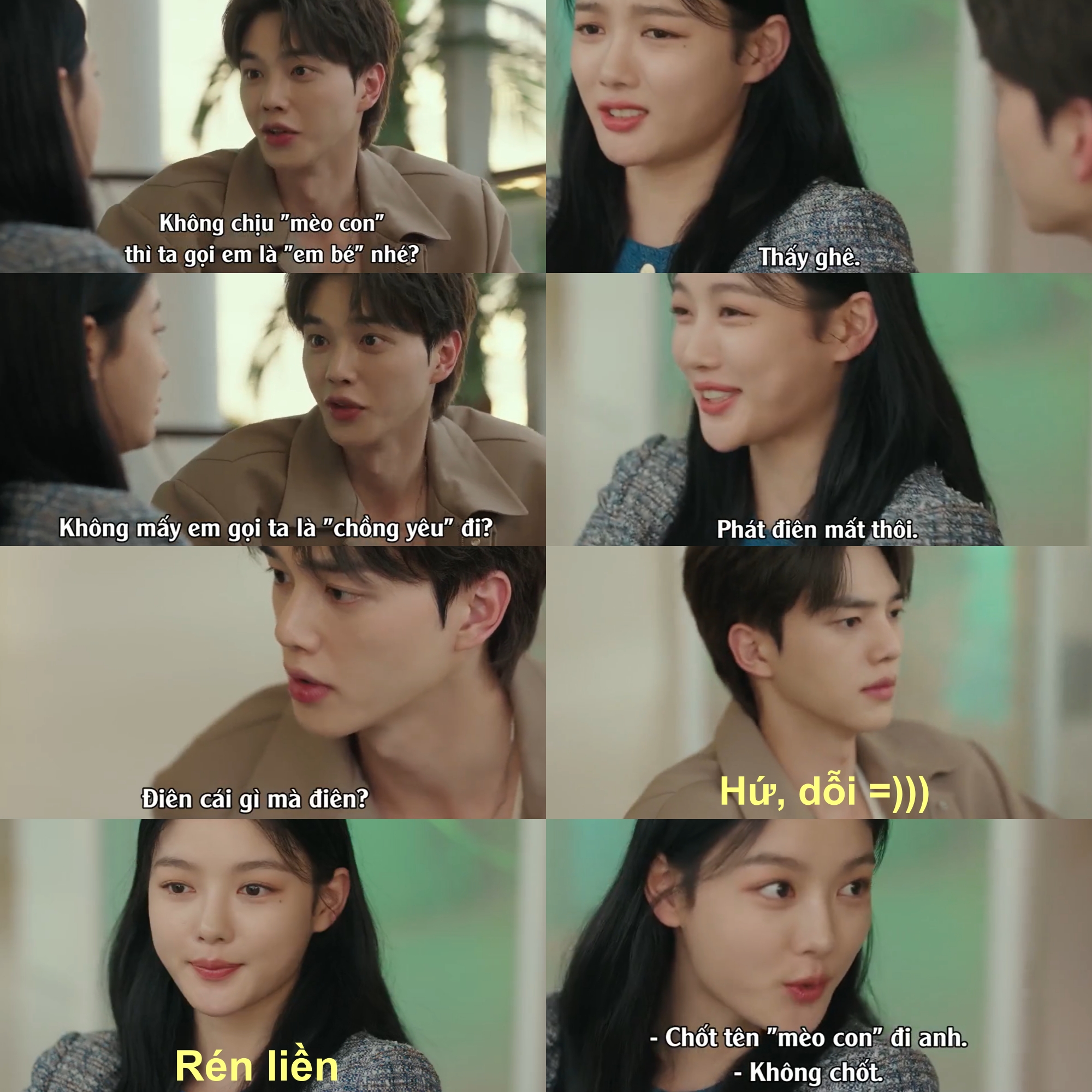 Về phần Do Do Hee, cô thấy những biệt danh này quá sến, nghe thôi đã thấy ngượng ngùng đến điên lên được. Thấy vợ không chịu, Jeong Gu Won liền dỗi vợ khiến cô "rén" liền. Tuy nhiên, anh chàng cũng chỉ dỗi vợ được vài giây mà thôi. Nhìn khung cảnh hạnh phúc của cặp đôi này, khán giả không khỏi vừa xem phim vừa cười tủm tỉm.