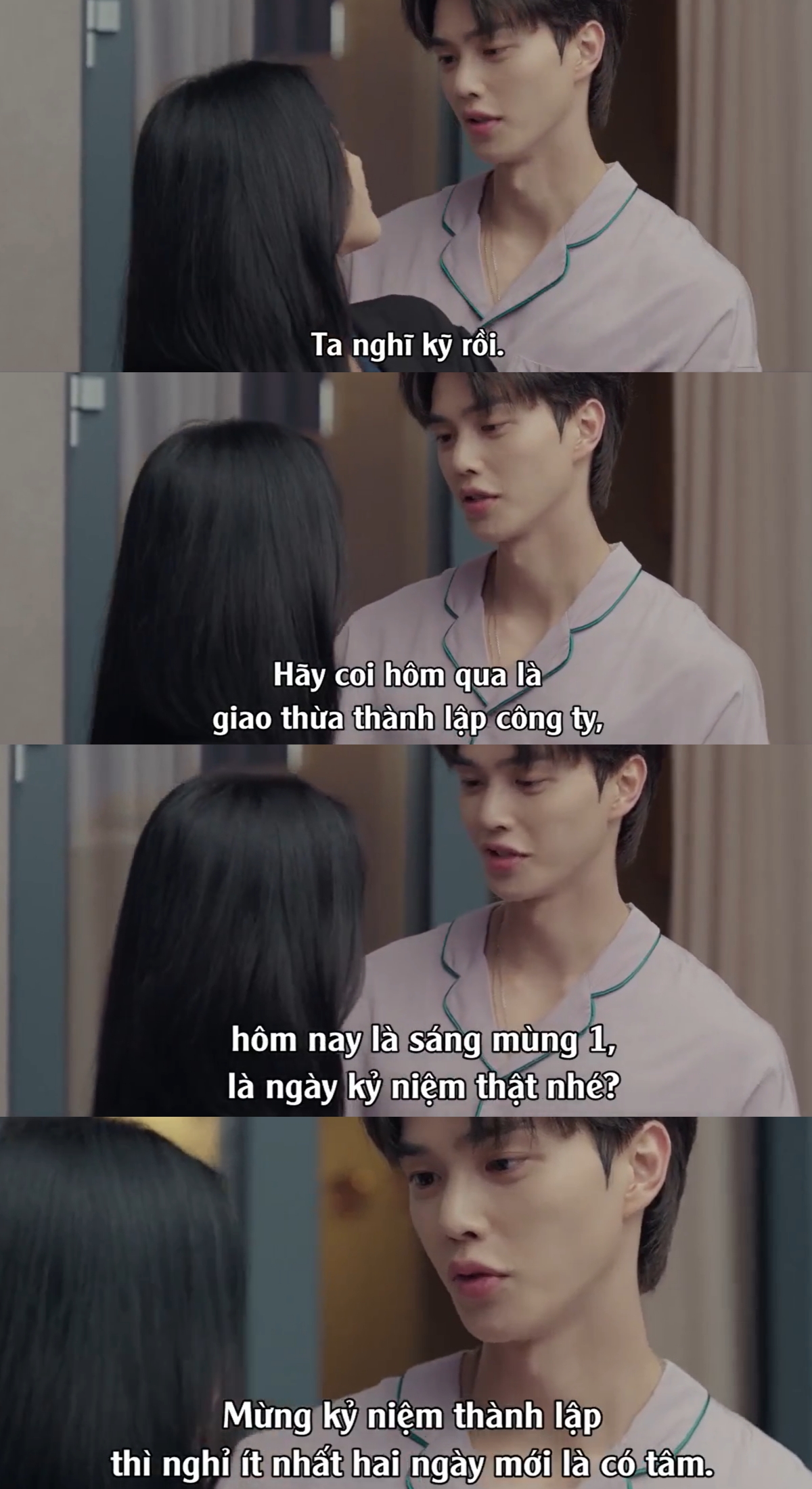 Để tăng sức thuyết phục, anh chàng còn bảo rằng thành lập công ty thì phải nghỉ ít nhất hai ngày mới là có tâm. Câu thoại này làm ai xem cũng phải bật cười, đồng thời cảm thấy hạnh phúc thay cho "đôi chim cu".