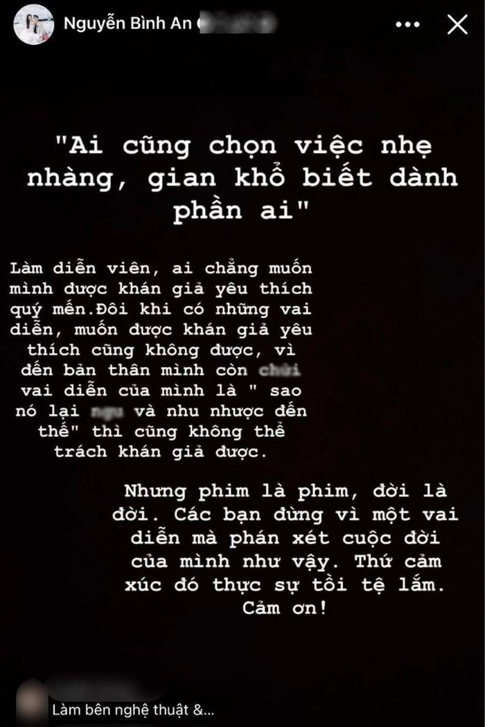 Thế nhưng, nhiều người lại lấy nhân vật trong phim để đánh giá Bình An ngoài đời khiến nam diễn viên 29 tuổi không khỏi buồn lòng: "Nhưng phim là phim, đời là đời. Các bạn đừng vì một vai diễn mà phán xét cuộc đời mình như vậy. Thứ cảm xúc đó thực sự tồi tệ lắm. Cám ơn!".