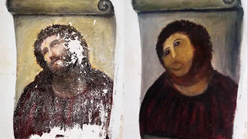 Bức họa không quá nổi bật cho đến năm 2012, khi giáo dân Cecilia Gimenez, lúc đó đã 82 tuổi, quyết định phục chế lại tác phẩm. Độ ẩm trên tường khiến cho một số lớp sơn bị bong ra.