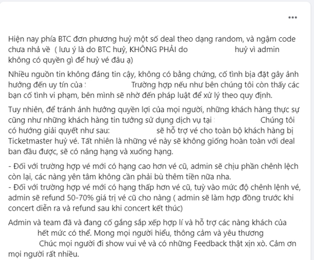 Tuy nhiên câu trả lời từ đơn vị bán vé trung gian không thỏa đáng. Admin của S.C cho biết Ticketmaster đã đơn phương hủy vé ngẫu nhiên ở một số tài khoản mà phía Ticketmaster cho là “khả nghi” mà không không hề báo trước. Họ cũng đưa ra phương hướng giải quyết cho các khách hàng như sau: cung cấp deal có sẵn cho khách, nếu khách được hạng cao hơn thì không mất tiền thêm, nếu nhận hạng thấp hơn thì được bồi hoàn tiền chênh lệch.