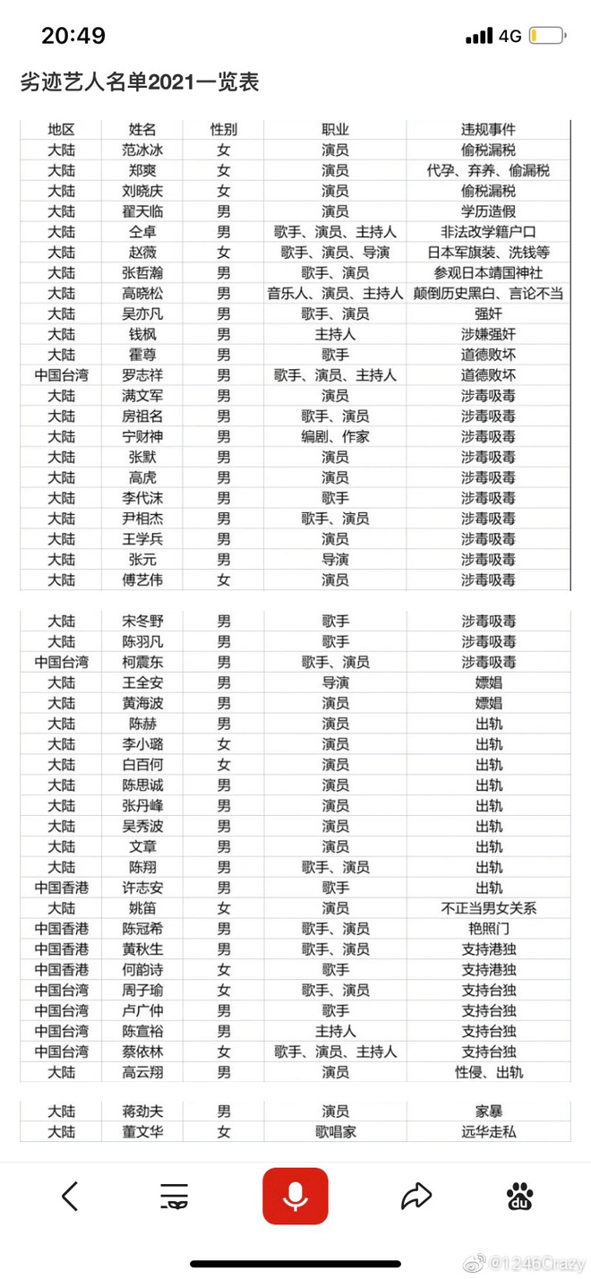 Không dừng lại ở đó, trong 1 văn bản mới nhất mang tên: "Danh sách nghệ sĩ ô danh năm 2021" bao gồm 47 người, 1 số cái tên từng vướng scandal trốn thuế, ngoại tình từ nhiều năm trước cũng bị réo tên như sau: Lưu Hiểu Khánh (trốn thuế), Mạc Văn Quân, Phòng Tổ Danh, Ninh Tài Thần, Trương Mặc, Cao Hổ, Doãn Tương Kiệt (dùng chất cấm), Lý Tiểu Lộ, Trần Hách, Bạch Bách Hà, Trần Tư Thành, Trương Đan Phong, Trần Quán Hy (ngoại tình). Tuy nhiên, tất cả đều là danh sách không thuộc bộ Văn hoá và Du lịch Trung Quốc công bố, còn Quảng Điện chưa đưa ra bất cứ phản hồi nào.