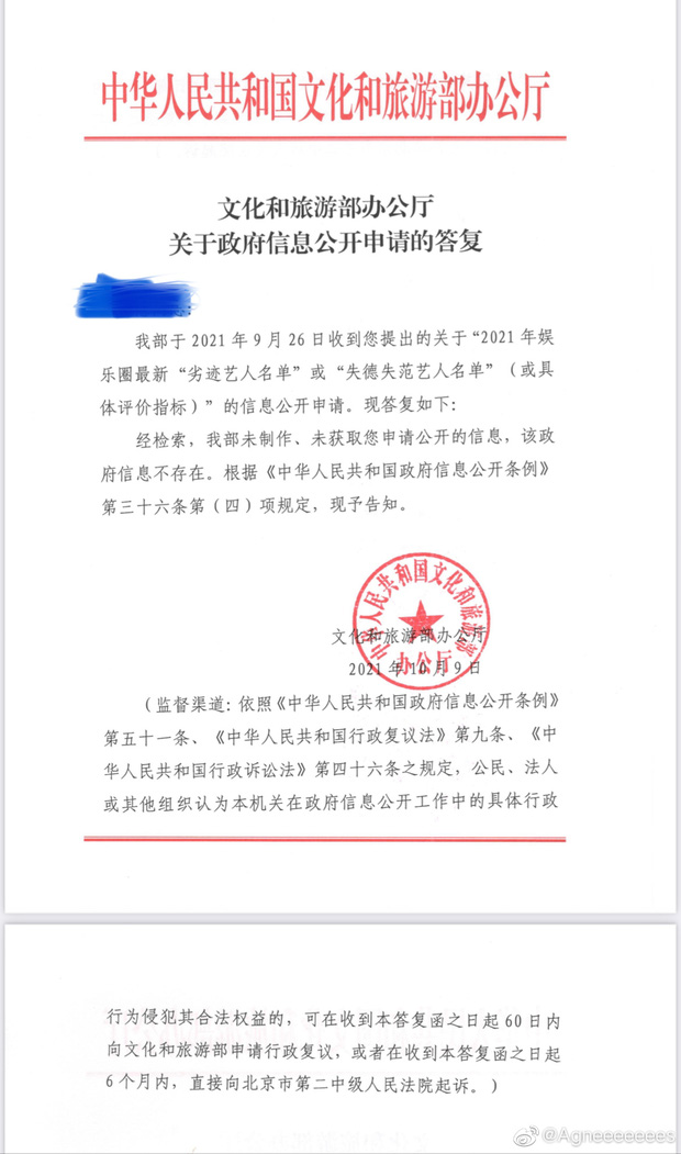 Vậy nhưng trong 1 diễn biến mới nhất, 1 netizen đã gửi thông tin về phía Bộ Văn hoá và Du lịch Trung Quốc về danh sách cấm sóng nghệ sĩ được lan truyền khắp các diễn đàn và MXH. Cuối cùng, phía văn phòng đại diện của Bộ đã đưa ra văn bản kèm dấu đỏ trả lời thắc mắc của đông đảo người hâm mộ thời gian qua.