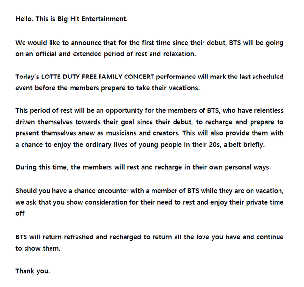 Như vậy, sau lịch trình tại Lotte Duty Free Family concert ngày 11/8, BTS chính thức "đóng băng" hoạt động để tận hưởng kỳ nghỉ ngơi. Big Hit Entertainment cũng rất mong người hâm mộ thông cảm và hợp tác trong việc giúp BTS duy trì sự riêng tư và tận hưởng thời gian nghỉ ngơi của nhóm.