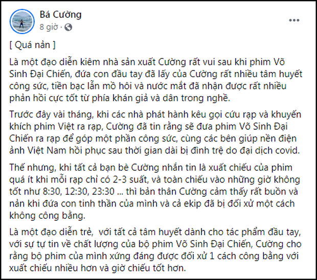Trước đó, chính ông và đạo diễn Bá Cường đã chia sẻ trên mạng xã hội về chuyện phim bị ép suất, chỉ được chiếu vào các khung giờ xấu (12h trưa hoặc 8h sáng).