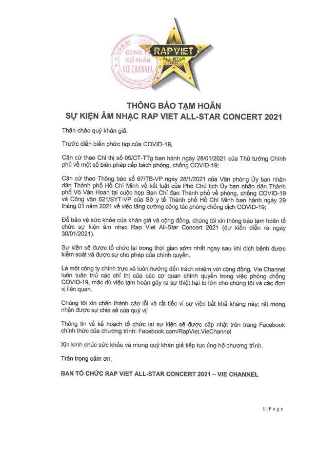 Trước tình hình dịch Covid-19 đang bùng phát trở lại tại Việt Nam, Rap Việt All-Star Concert buộc phải tạm hoãn. Thông tin này vừa được phía BTC chương trình thông báo đến tất cả khán giả.