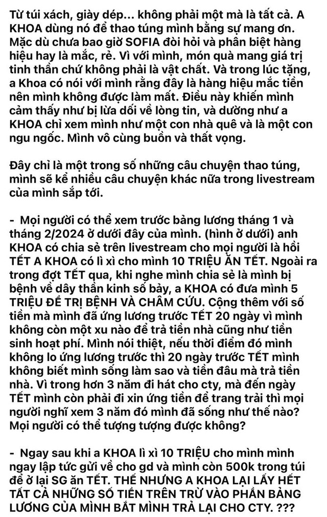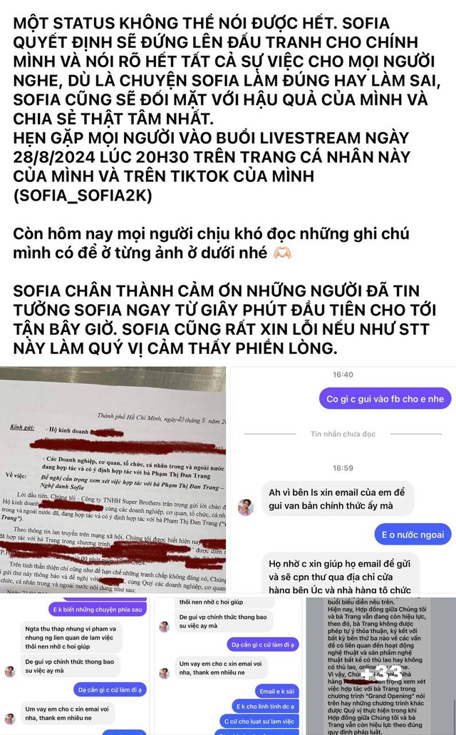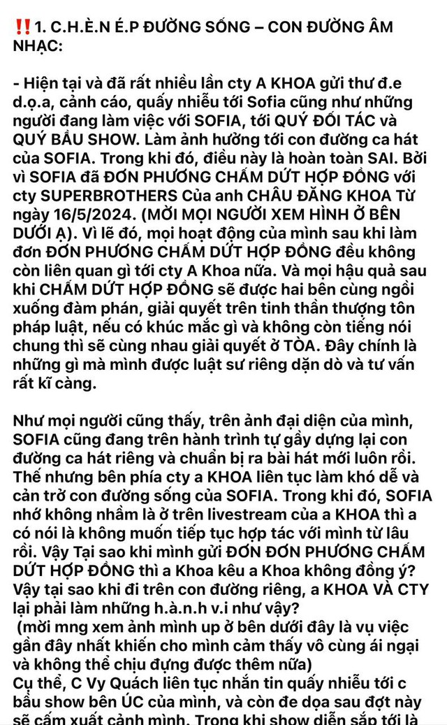 Tối 26/8, Sofia bất ngờ chia sẻ một bức tâm thư rất dài thông báo về việc cô đang bị NS Châu Đăng Khoa và công ty Superbrothers áp bức. Bức tâm thư lập tức gây xôn xao dư luận bởi có nhiều chi tiết lần đầu được Sofia kể khiến khán giả không khỏi giật mình.