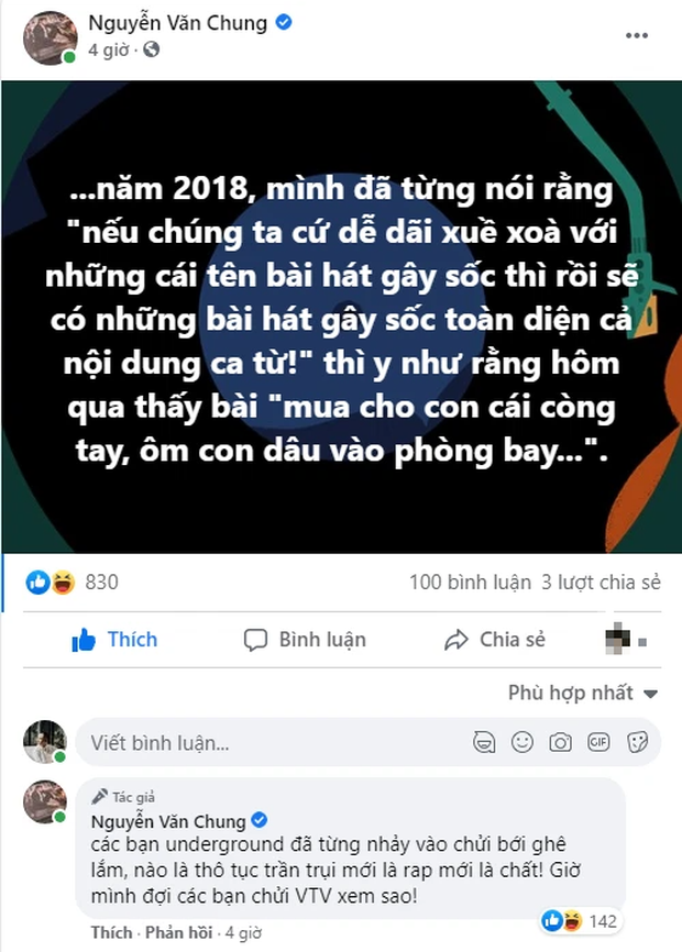 Ở dưới phần bình luận, NS Nguyễn Văn Chung cũng nói thêm khi anh phát ngôn chỉ trích về sự dung tục trong ca từ, nhiều nghệ sĩ Underground đã từng nhảy vào chửi bởi, cho rằng thô tục trần trụi mới là rap, mới "chất". Giờ đây, chính VTV cũng đã lên tiếng về vấn nạn ca từ không phù hợp thuần phong mỹ tục trong chương trình Đối Diện: Dọn rác trên không gian mạng khiến dư luận xôn xao những ngày qua.
