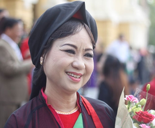 | NSND Thúy Cải trong trang phục liền chị quan họ. Ảnh: Khuê Tú |
