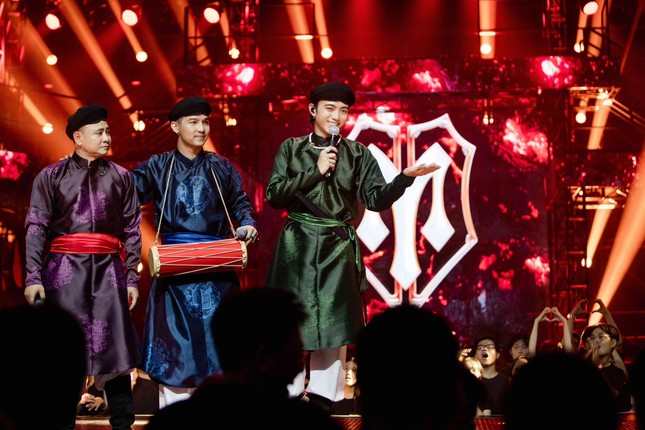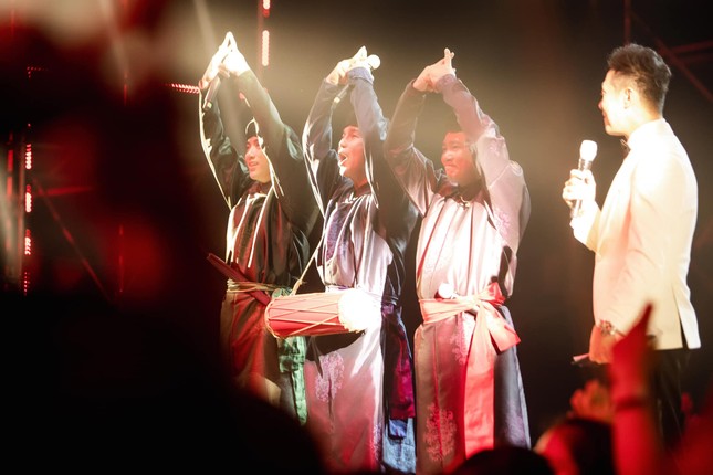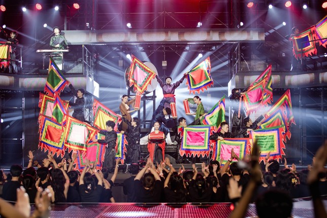 Hơn thế, nhóm đưa quạt giấy, khăn đóng, áo ngũ thân, cờ ngũ sắc, đàn bầu… lên sân khấu, kết hợp nhảy hiện đại, tất cả mang đến màn trình diễn cảm xúc, đậm đà giá trị văn hóa.