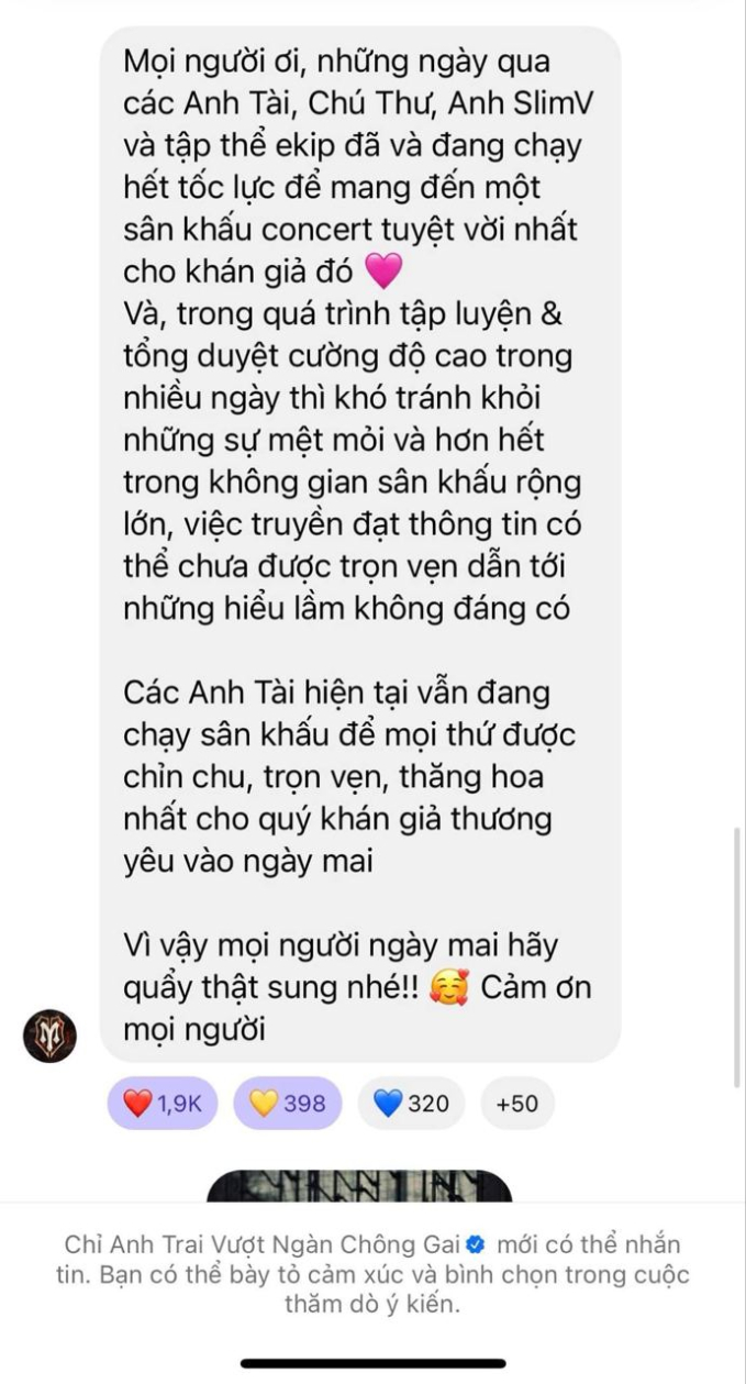"Mọi người ơi, những ngày qua các Anh Tài, Chú Thư, Anh SlimV và tập thể ekip đã và đang chạy hết tốc lực để mang đến một sân khấu concert tuyệt vời nhất cho khán giả đó. Và, trong quá trình tập luyện & tổng duyệt cường độ cao trong nhiều ngày thì khó tránh khỏi những mệt mỏi và hơn hết trong không gian sân khấu rộng lớn, việc truyền đạt thông tin có thể chưa được trọn vẹn dẫn tới những hiểu lầm không đáng có. Các Anh Tài hiện tại vẫn đang chạy sân khấu để mọi thứ được chỉn chu, trọn vẹn, thăng hoa nhất cho quý khán giả thương yêu vào ngày mai. Vì vậy mọi người ngày mai hãy quẩy thật sung nhé!! Cảm ơn mọi người."