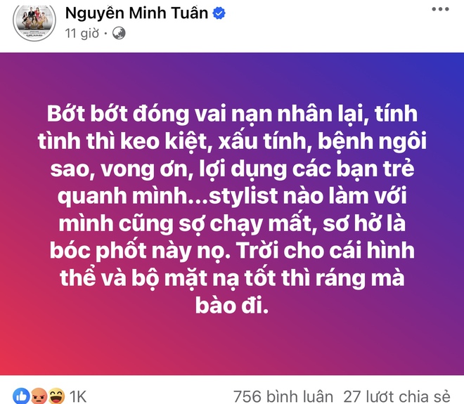 Trước đó, khi ồn ào diễn ra vào tối 11/7 vừa mới nổi ra, netizen còn đứng ngồi không yên vì bài viết ẩn ý của một nhà thiết kế Việt. Cụ thể trên trang cá nhân, NTK Nguyễn Minh Tuấn gay gắt cho rằng người này có nhiều khuyết điểm, sống không biết điều tuy nhiên không chỉ đích danh tên bất kỳ ai: "Bớt bớt đóng vai nạn nhân lại, tính thì keo kiệt, xấu tính, bệnh ngôi sao, vong ơn, lợi dụng các bạn trẻ quanh mình.