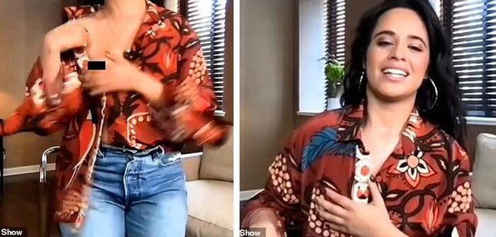 Tuy nhiên, trong lúc dùng tay vuốt tóc, móng tay của cô nàng đã vướng vào vai áo và kéo chiếc áo lệch hẳn sang một bên. Sự cố này khiến Camila Cabello lộ gần hết vòng 1 ngay trên sóng truyền hình, nữ ca sĩ sau đó đã bình tĩnh và chỉnh đốn lại trang phục như chưa có chuyện gì xảy ra.