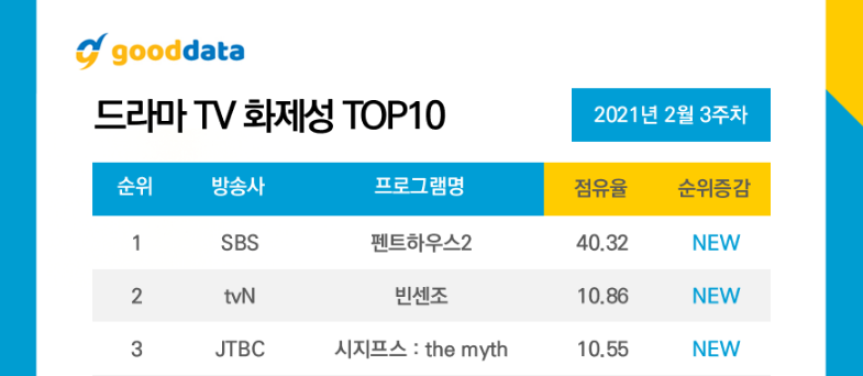 Theo thống kê từ Good Data Corporation vào ngày 24/02, danh sách những bộ phim nhận được nhiều sự quan tâm nhất từ công chúng lần lượt thuộc về Penthouse 2, Vincenzo và Sisyphus: The Myth. Kết quả này được tổng hợp từ việc phân tích các bài báo tin tức, bài đăng trên blog, cộng đồng trực tuyến, video và bài đăng trên mạng xã hội về 18 bộ phim truyền hình hiện đang phát sóng hoặc sắp phát sóng tại Hàn Quốc.