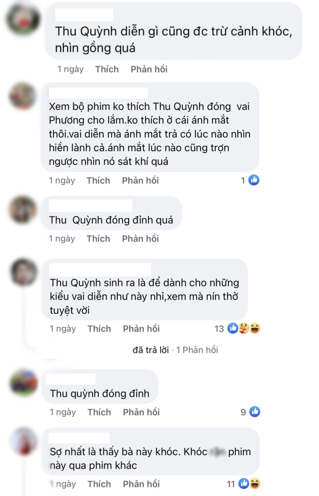 Trước màn trình diễn cảm xúc của Thu Quỳnh, khán giả lại không hoàn toàn hài lòng. Trên fanpage của VTV, dưới trích đoạn nhân vật Phương rơi vào nguy hiểm và được giải cứu, có không ít những bình luận trái chiều. Rất nhiều khán giả khen ngợi khả năng diễn xuất, biểu cảm linh hoạt của cô. Thế nhưng bên cạnh đó lại có không ít bình luận cho rằng Thu Quỳnh diễn cảnh khóc nhìn không tự nhiên, rất gượng và nặng nề. Ngay cả ánh mắt sắc bén đã giúp Thu Quỳnh thành công ở loạt phim trước đây cũng bị cho là một điểm trừ ở bộ phim lần này.