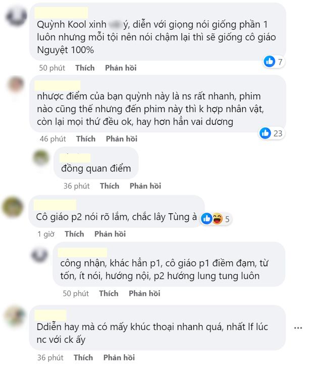 Là điểm sáng của bộ phim nhưng trên thực tế, Quỳnh Kool vẫn nhận về một số phản hồi trái chiều xoay quanh màn thể hiện của mình. Cụ thể một số bình luận cho rằng nữ diễn viên thoại rất nhanh, đã thế nhân vật Nguyệt ở phần 2 còn nói hơi nhiều. Cả hai đặc điểm này đều trái ngược hẳn với Nguyệt ở phần 1: một cô gái dịu dàng, từ tốn và rất kiệm lời. Dù ngoại hình và nét diễn của Quỳnh Kool mang đến sự nhất quán với phần 1 nhưng khi cô cất lời lại khiến khán giả thấy "hơi xa lạ".