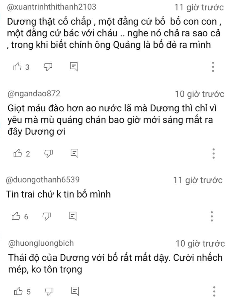 - Đứa con mất nết, ngạo mạn, cố chấp. Ông bố đã hết sức nhún nhường nhưng vẫn bị con không tin. Ông này nên buông tay, không bố con gì nữa cho rảnh nợ và phải nghe những lời nói móc máy, mất dạy, cao giọng đay nghiến bố đẻ mình. Ghê tởm cô gái này!