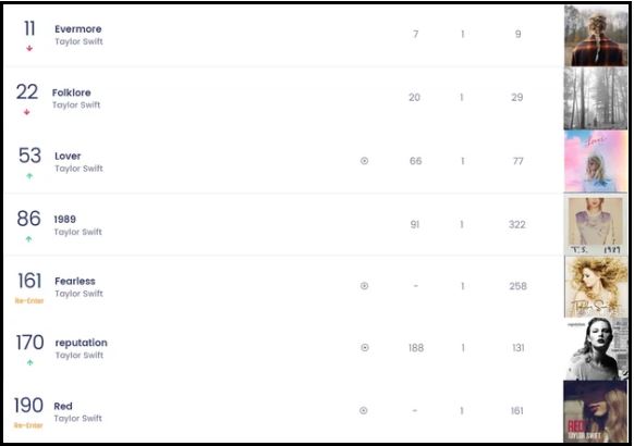 Và 7 album đó của Taylor Swift bao gồm evermore (hạng 11), folklore (hạng 22), Lover (hạng 53), 1989 (hạng 86), Fearless (hạng 161), Reputation (hạng 170) và Red (hạng 190). Chỉ có Taylor Swift và Speak Now là nằm ngoài Billboard 200.