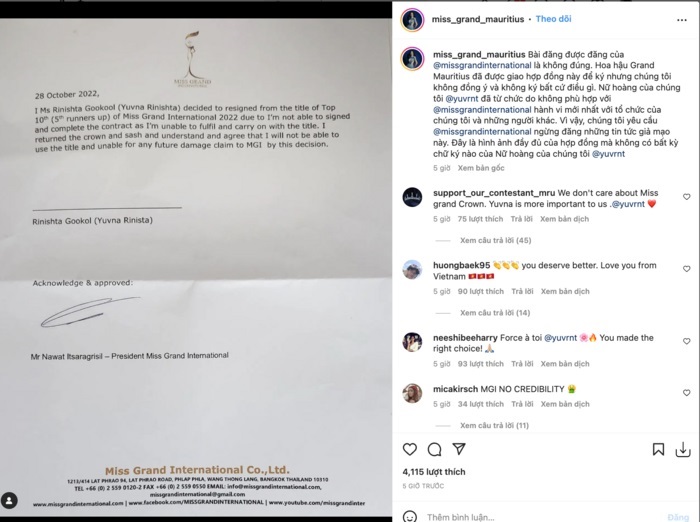 Sự kiện đáng chú ý nhất chính là Á hậu 5 thuộc Top 10 Miss Grand 2022 - đại diện Mauritius đã chính thức từ ngôi vì cảm thấy không còn phù hợp với tổ chức này. Tuy nhiên, thông tin này đã bị trang chủ của Miss Grand "sửa đổi" thành nội dung như sau: “Thông báo chính thức, Miss Yuvna Rinishta (Mauritius) đã đưa ra quyết định từ bỏ danh hiệu do không thể ký hợp đồng và hoàn thành nhiệm vụ với tư cách là Á hậu 5. Cô ấy không thể tiếp tục sử dụng danh hiệu kể từ lúc này. Người giữ danh hiệu mới sẽ sớm được công bố”.