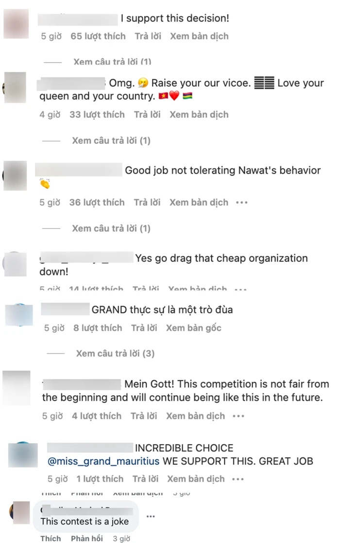 Sau khi tổ chức Miss Grand Mauritius đính chính cho hoa hậu của nước họ, nhiều fan sắc đẹp quốc tế đã tràn vào ủng hộ việc từ bỏ ngôi vị của Yuvna Rinishta hoàn toàn đúng đắn. Trước đó, ông Nawat - chủ tịch cuộc thi đã có những phát ngôn sốc, có tính chất kém văn minh về Thiên Ân và tổ chức Miss Universe. Chưa kể tiêu chí lựa chọn hoa hậu "sặc mùi tiền" của ông: "Hoa hậu là người phải có năng lực giúp tôi kiếm tiền".