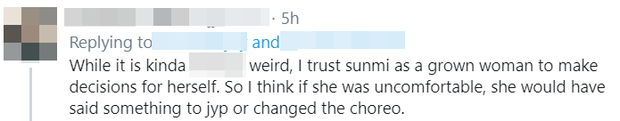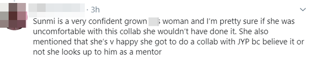 Tuy nhiên không phải ai cũng đồng tình với ý kiến của những cư dân mạng nói trên. Họ cho rằng cựu thành viên Wonder Girls đã là 1 người phụ nữ trưởng thành và độc lập. Nếu cô cảm thấy không thoải mái thì có thể góp ý ngay từ quá trình dựng vũ đạo. Chưa kể Sunmi từng bày tỏ là mình rất vui khi được hợp tác với Park Jin Young.