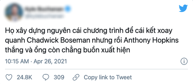 Thay vào đó, người được xướng tên lại là nam diễn viên gạo cội Anthony Hopkins cho bộ phim The Father. Mặc dù chiến thắng của ông là hoàn toàn xứng đáng, đây vẫn là điều ít ai ngờ vì bản thân bộ phim cũng không quá nổi tiếng như nhiều đối thủ đang tranh đấu cùng hạng mục.