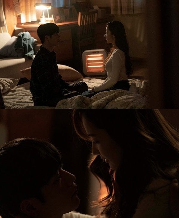Cảnh phim tình cảm này không quá dữ dỗi, không quá lộ liễu mà rất nhẹ nhàng, lãng mạn và đầy tính nghệ thuât. Mok Hae Won và Im Eun Seob đang đối mặt nhau khi ngồi trên chăn. Ánh sáng duy nhất mờ nhạt lấp lòa phát ra từ chiếc đèn ngủ, âm thanh duy nhất có thể nghe thấy tiếng đập mạnh mẽ của đôi tim yêu nhau ấy. Từ ánh mắt đến đôi môi kéo họ lại gần nhau, Park Min Young đẹp không góc chết ngay cả trong những góc quay tối nhất.