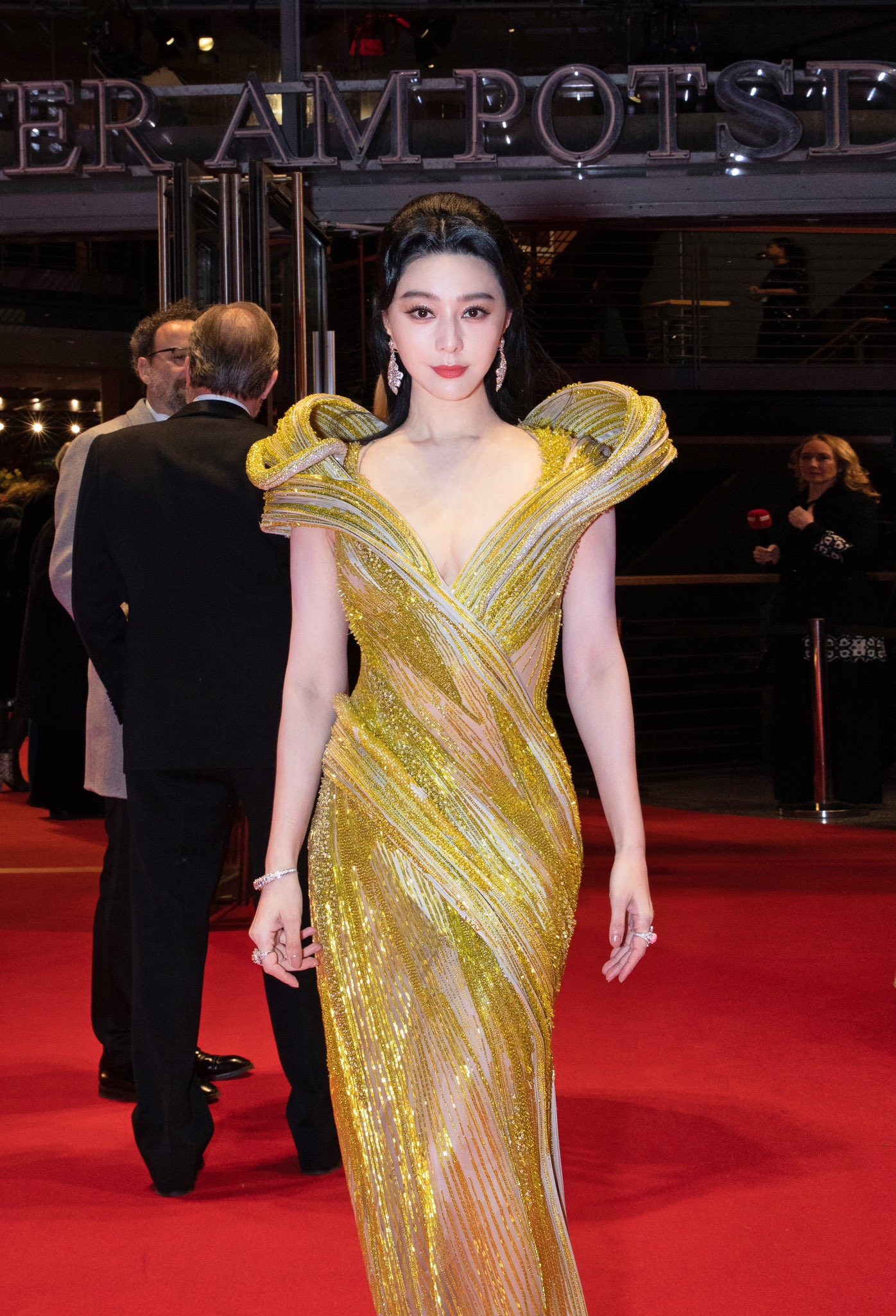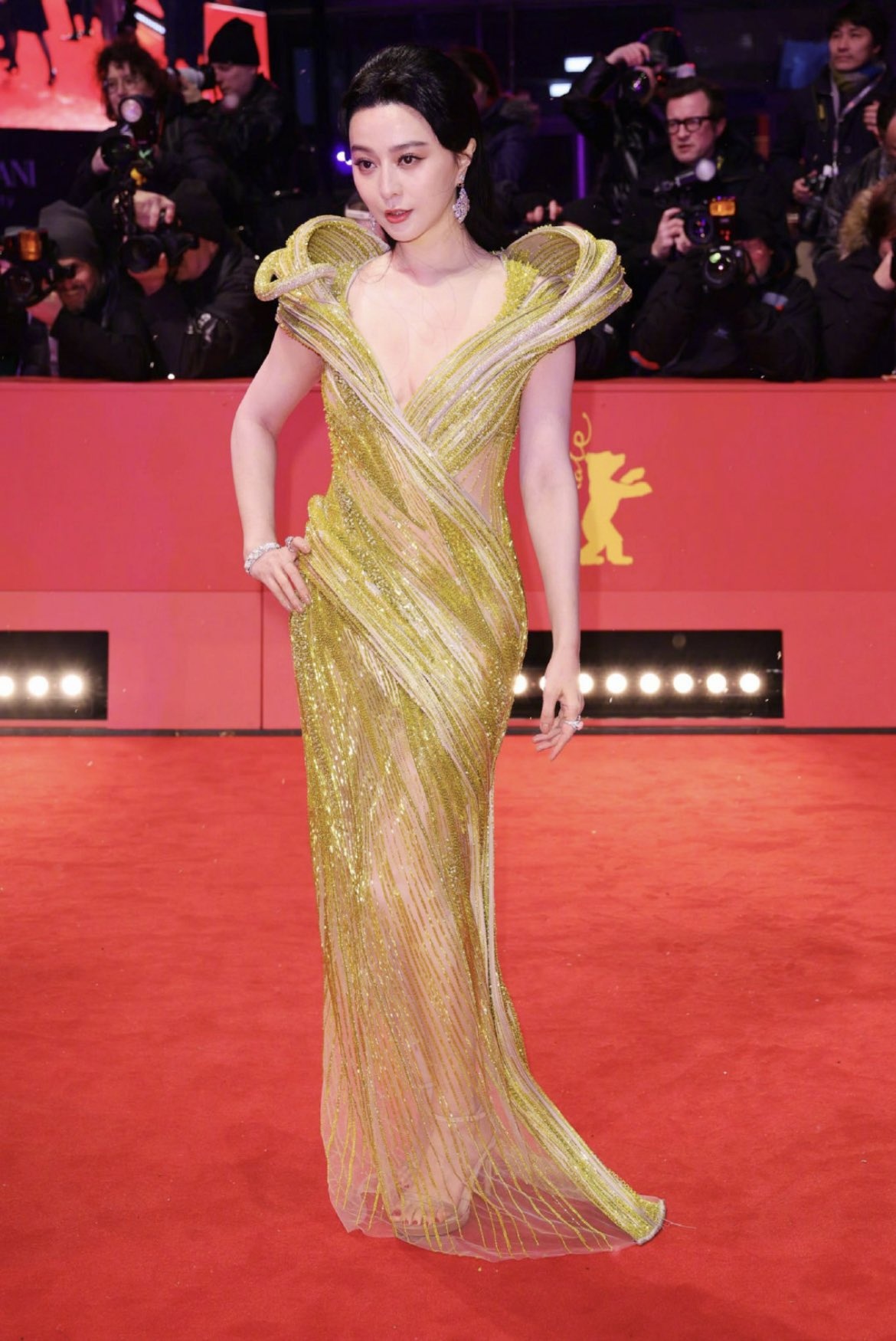 Liên hoan phim (LHP) Berlin lần thứ 73 được tổ chức tại Đức từ ngày 16/2 đến 26/2. Trong đêm bế mạc, bất chấp thời tiết lạnh khoảng 2 độ C và có tuyết nhẹ, mẫu váy xuyên thấu, cắt xẻ vẫn được các minh tinh lăng xê trên thảm đỏ. Phạm Băng Băng diện váy sequin xuyên thấu đến từ nhà mốt Gaurav Gupta. Mẫu váy xẻ ngực sâu, ôm dáng giúp nữ diễn viên nổi bật ở sự kiện.