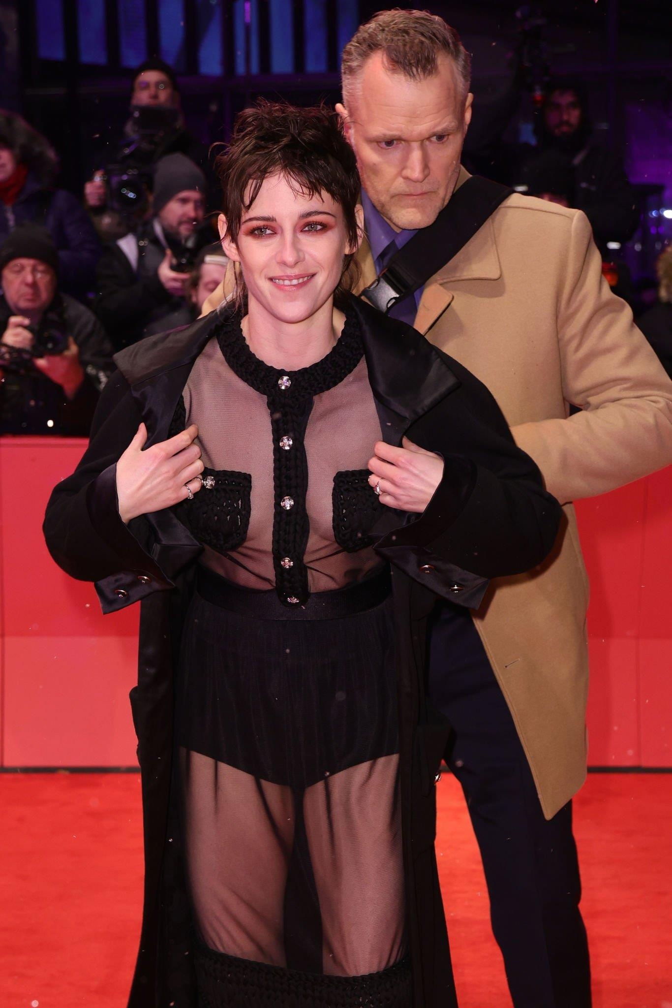 Trong khi đó, Kristen Stewart diện đồ trong suốt, để lộ ngực trần, điểm nhạy cảm chỉ được che lại bằng túi áo. Kiểu tóc bết của nữ diễn viên cũng gây ra nhiều ý kiến trái chiều. Nhiều người cho rằng diện mạo của Kristen Stewart cá tính, nhưng cũng có ý kiến trái ngược.