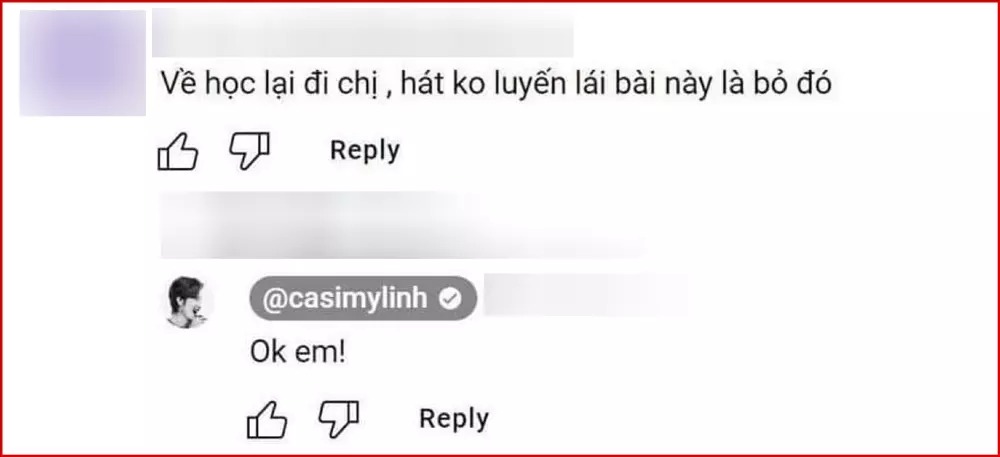 Cụ thể, một netizen đã vào tận đoạn clip ghi lại màn trình diễn Trên Đỉnh Phù Vân của Mỹ Linh tại đêm nhạc vào năm 2015 để lại ý kiến: "Về học lại đi chị, hát không luyến láy bài này là bỏ đó". Lập tức, nữ diva đã hồi đáp 1 dòng ngắn gọn: "Ok em!".