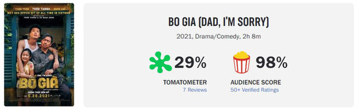 Hôm nay 18/2, cư dân mạng không ngừng bàn tán trước thông tin phim Bố già của Trấn Thành chiếu ở nước ngoài bị trang đánh giá phim ảnh nổi tiếng Rotten Tomatoes chấm 29% với 7 bài đánh giá, trong đó có tới 5 bài dành lời chê bai và nhận xét là tệ.
