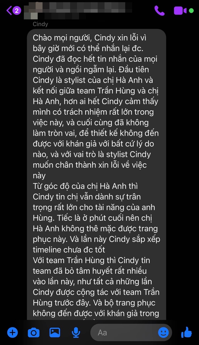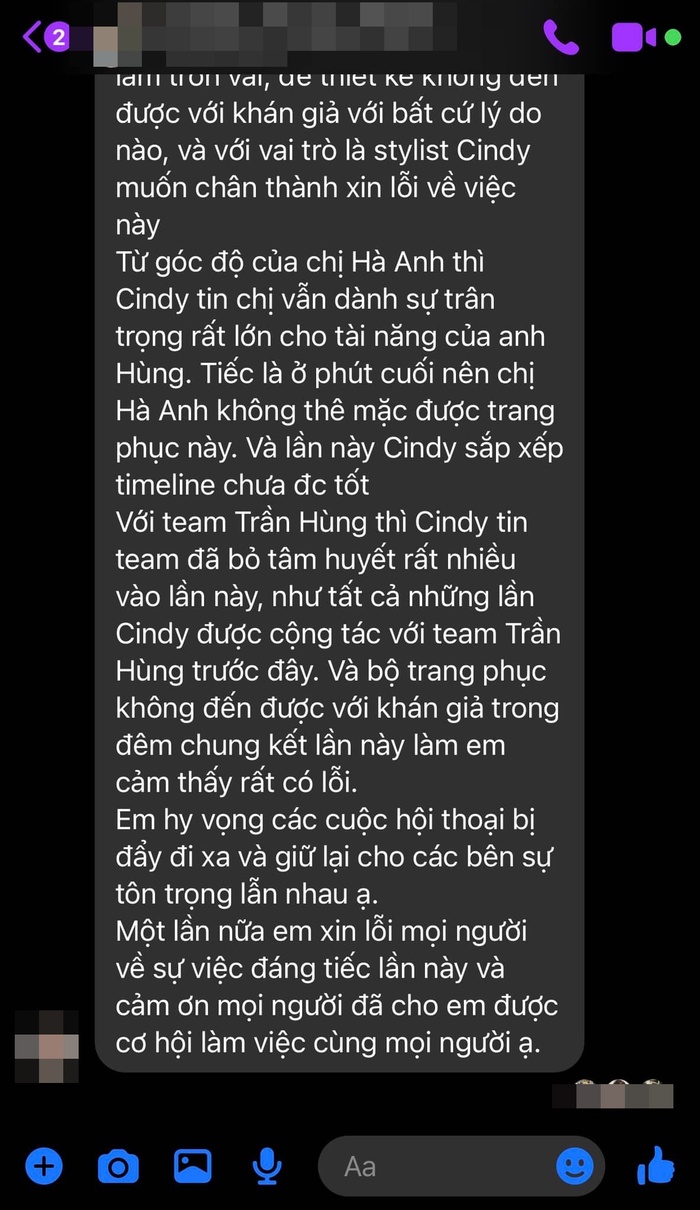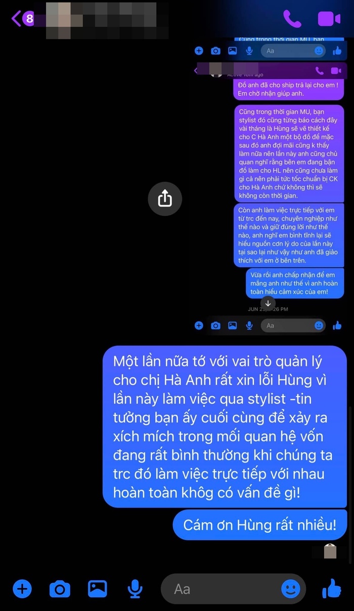 Quản lý Hà Anh chia sẻ các đoạn tin nhắn từ phía mình nhắn cho bên NTK và stylist về việc bạn nhận trách nhiệm không sắp xếp được thời gian tốt cho lần này, dẫn đến các hiểu lầm giữa NTK và Hà Anh.