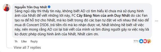 Phía Duy Nhất khẳng định không liên quan đến vụ việc hay fanpage Cây Bàng Non Của Anh Duy Nhất. Dưới phần bình luận ở 1 bài đăng, Nguyễn Trần Duy Nhất cũng để lại bình luận qua tài khoản chính chủ với nội dung tương tự.