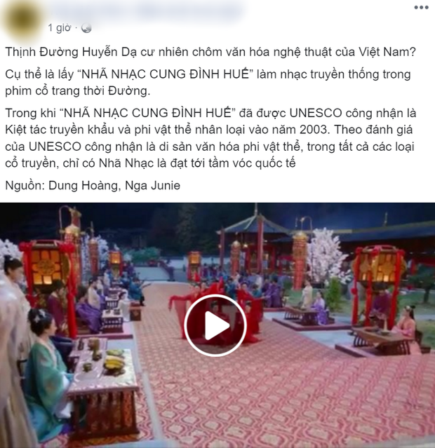 Thịnh Đường Huyễn Dạ - một bộ phim cổ trang Trung Quốc lên sóng năm 2018 bị tố 'ăn cắp' văn hóa nghệ thuật của Việt Nam. Sự việc được khán giả Việt phát hiện và chia sẻ rầm rộ trên fanpage phim Hoa ngữ.
