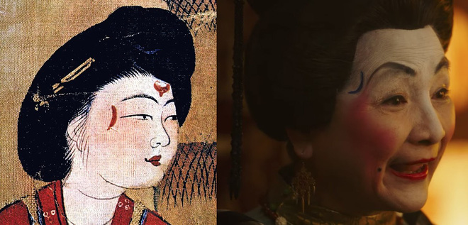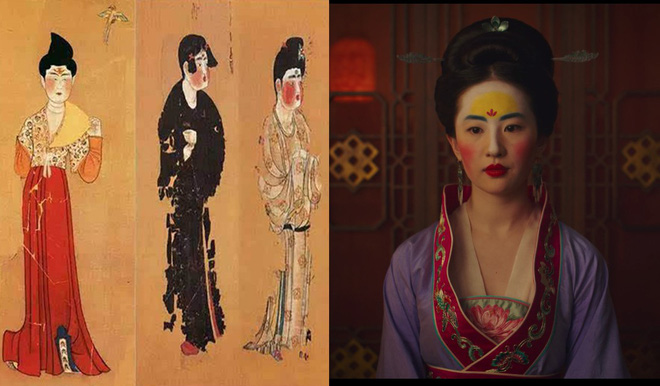Ở cảnh phim sau, khi Mộc Lan tới gặp một vị phu nhân, được trang điểm và dặn dò những phẩm chất của phận làm vợ, vị phu nhân này trang điểm theo kiểu "Tà Hồng" thịnh hành vào thời Đường. Còn Mộc Lan lại trang điểm theo kiểu "Ngạch Hoàng" thuộc thời Nam Bắc Triều.