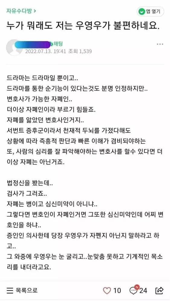 Một bài đăng với tiêu đề: ”Dù mọi người nói gì, tôi vẫn cảm thấy không thoải mái với Woo Young Woo” đang được chia sẻ rộng rãi trên nhiều diễn đàn trực tuyến.