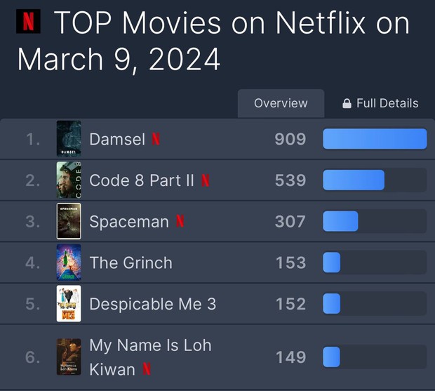 Cụ thể sau 1 ngày, Damsel đã đứng hạng 1 toàn cầu tại hạng mục phim điện ảnh của Netflix. Dự án của Millie Bobby Brown thống trị 82 quốc gia, trong đó tại Việt Nam thì debut tại vị trí thứ 2.