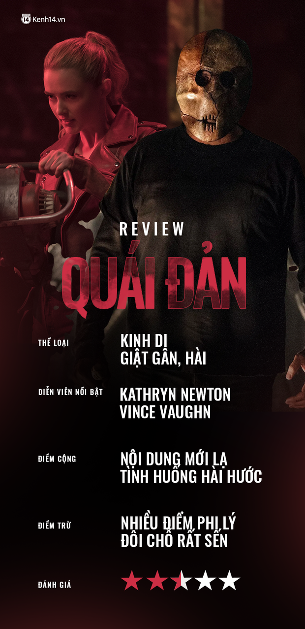 Phim kinh dị về sát nhân tàn độc bây giờ không thiếu, tuy nhiên một bộ phim kinh dị với chủ đề hoán đổi thân xác kỳ quái giữa một gã đàn ông trung niên và một cô gái xinh non mơm mởn, thì là điều hiếm. Hãng Blumhouse đã lựa chọn dịp cuối năm 2020 để cho ra mắt Quái Đản (tựa gốc: Freaky) - một tác phẩm kinh dị, hài hước như vậy với sự tham gia của Kathryn Newton và Vince Vaughn. Phim tràn ngập những cảnh chém giết, những câu đùa tuổi teen và tất nhiên là một ông già hú hét rồi ưỡn ẹo chạy qua đường kiểu-con-gái-mới-lớn. Nghe qua thì cũng hay ho, nhưng thực sự chất lượng của phim như thế nào?