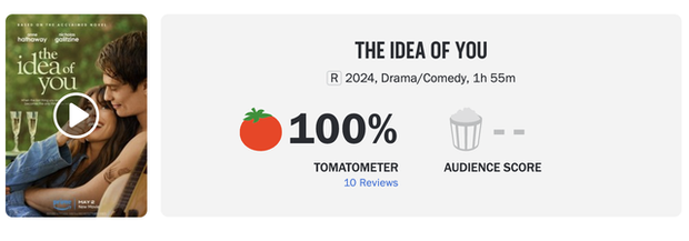 Dòng phim tình cảm tại Hollywood những năm gần đây không có nhiều khởi sắc, thường bị chê vì nội dung đi theo lối mòn và không còn thu hút được nhiều ngôi sao thực lực tham gia. Mới đây, một tác phẩm thuộc thể loại này bất ngờ gây tiếng vang khi công chiếu tại liên hoan phim South by Southwest (Mỹ) hồi giữa tháng 3. Đó là The Idea of You do minh tinh Anne Hathaway và nam thần kém cô 12 tuổi Nicholas Galitzine đóng chính. Tác phẩm hiện mở màn với điểm tuyệt đối 100% trên Rotten Tomatoes, nhận về nhiều lời khen ngợi từ giới phê bình.